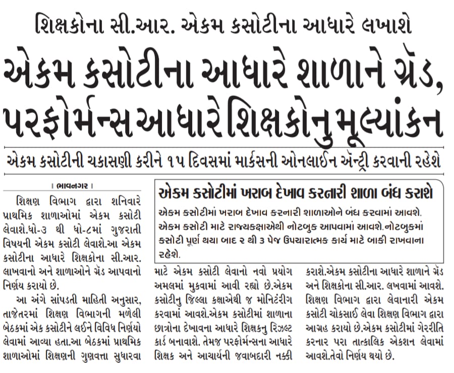UNIT TEST NA AADHARE SHALA NE GRADE TATHA PERFORMANCE AADHARE SHIXAKO NU MULYANKAN BABAT VANCHVA LAYAK SAMACHAR PAR EK NAJAR.